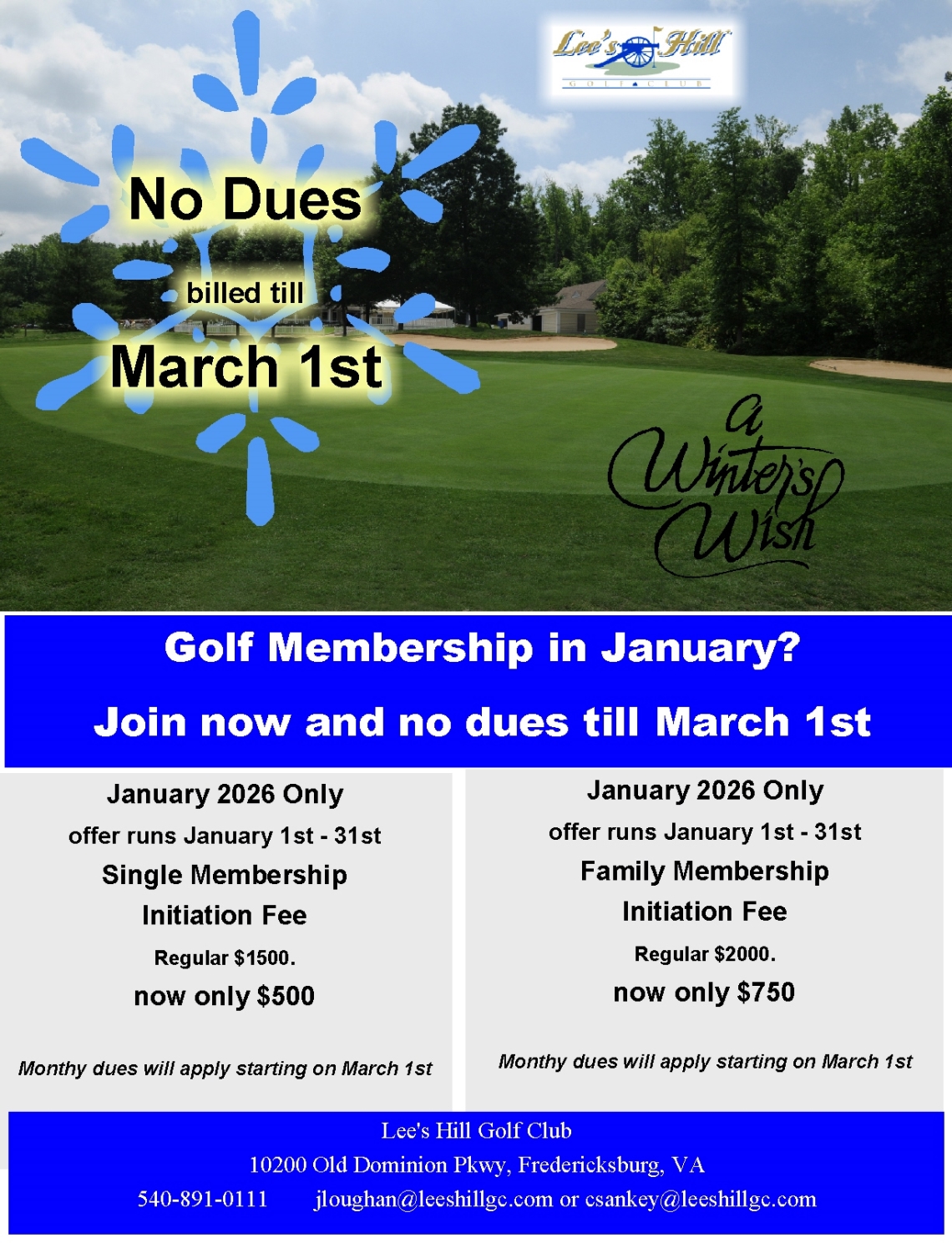 Call for Tee Times 540-891-0111 ******** Lee's Hill Golf Club Collection site for donated items only in support of all area SPCA's. Click here for details. *********** Lee's Hill Member Guest Special Thank you to our list of Sponsors ********** Fundraiser? Let us help. Click here or go to Golf Outing on the home page. *** *******